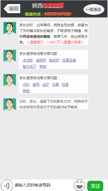 <p>家长您好,过年期间,我院全员放假,但是为了及时解决家长的疑虑,不耽误孩子病情,我院<strong>开设快速问诊服务</strong>,简单几步,给出指导方案。<span style="color: red;">(温馨提示:一岁以下儿童建议观察)</span></p>