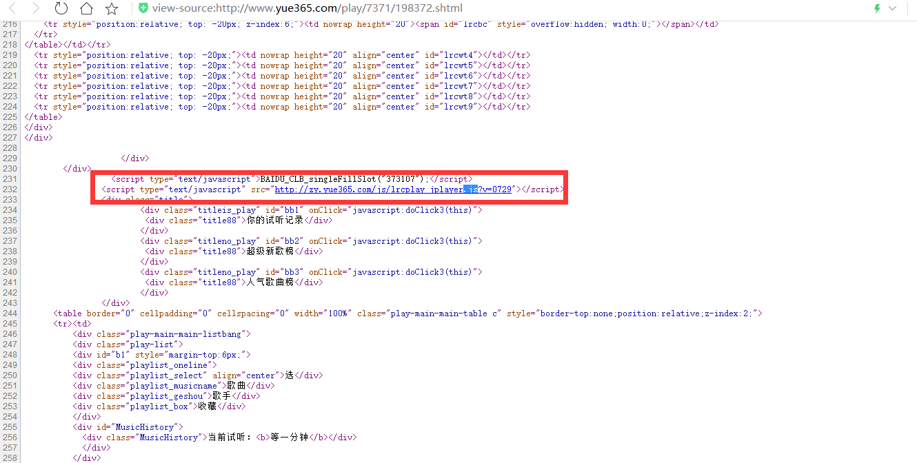 然后F12打开浏览器源码查看。将全文HTML源码拷贝到一个本地HTML文件中。文件名为music.html.红色标注处的地方是我们需要分析并获取所有歌曲的相应的musicid