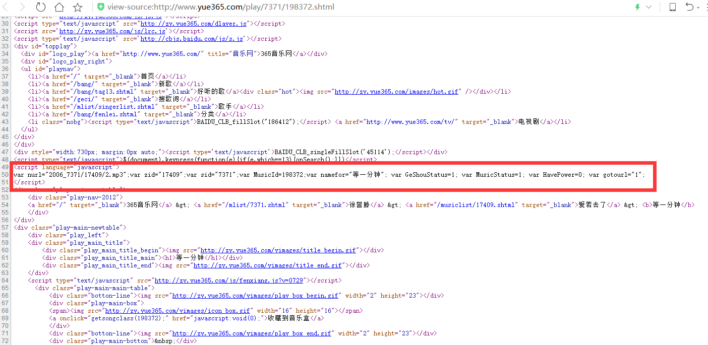 我以《等一分钟》为例子,打开页面。然后上F12,打开查看源码(红色标注处是关于因为相关信息。有可能是音乐ID)