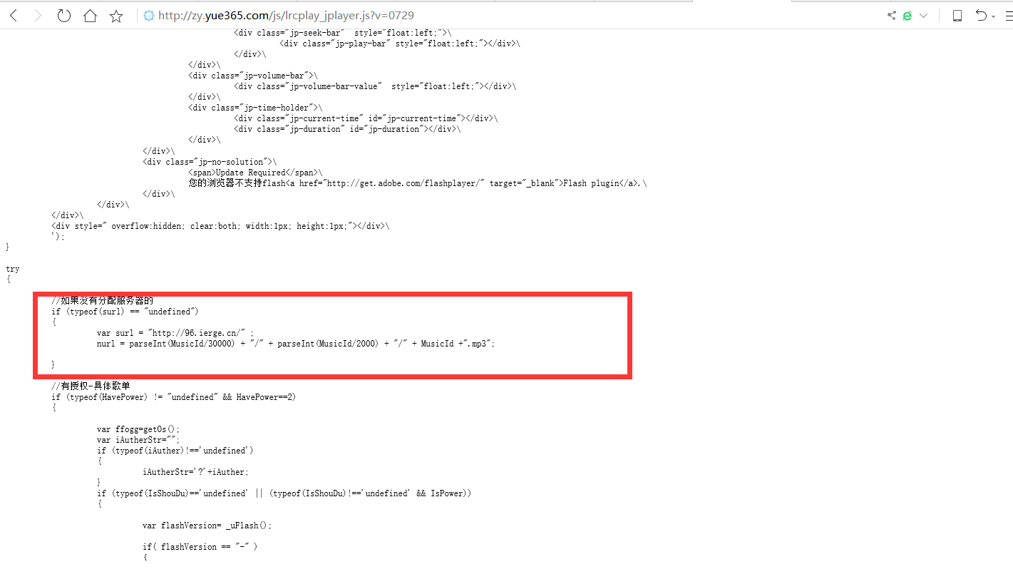 打开JS文档。找到下图红色标注处。这个地方就是来处理真实音乐地址的地方。我们发现了相应的规律。