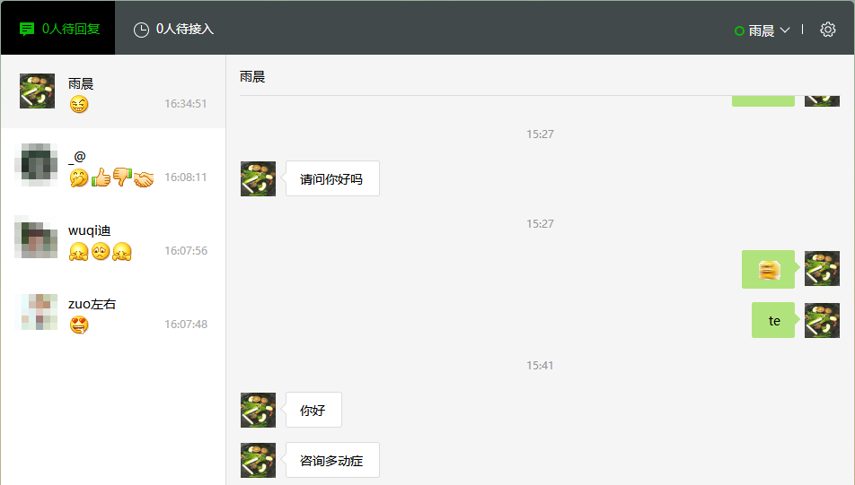 当用户点击按钮进入会话发送消息的时候。我们的消息将推送至微信后台,微信客服后台界面如下: