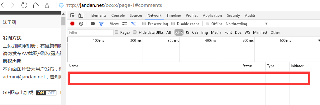 然后我们打开XHR。查看也没有Ajax请求。到这里很明显网站使用了js加载了图片。因为这个原因我们无法按常规方法爬取。