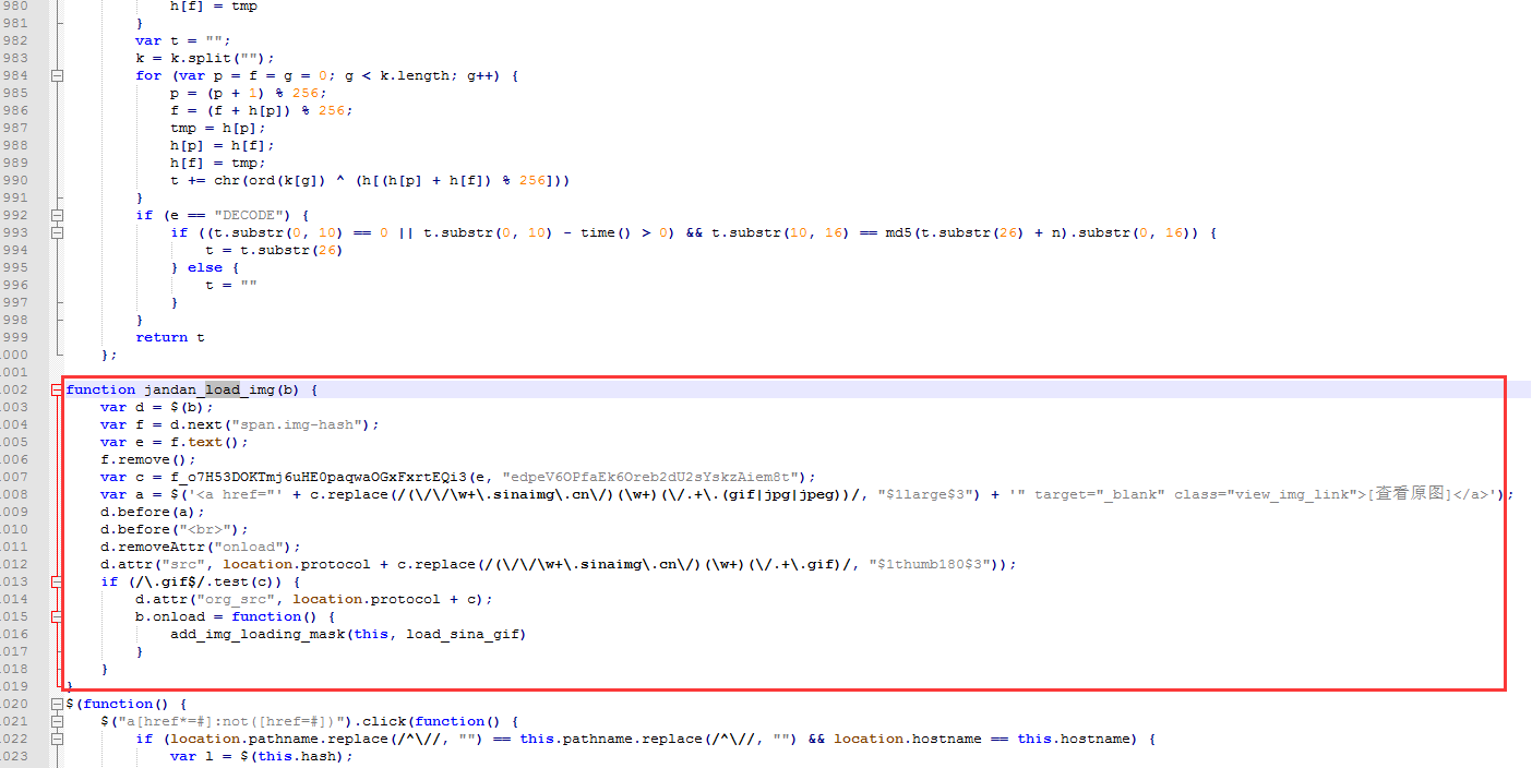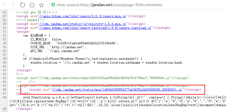 然后我们打开源文件。查看HTML源码分析发现如下js代码。