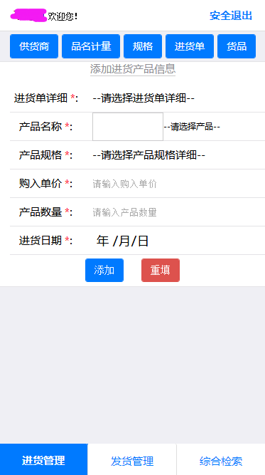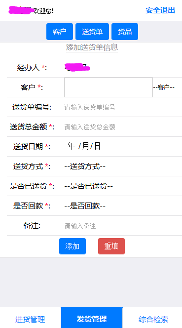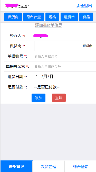 最近应朋友需求做了一个进销存系统。效果图如下: 登陆界面: 进货单页面: 进货单产品添加: 送货单界面: 送货单产品界面: 进货单查询: 送货单查询: 这个系统主要是辅助PC端后台系统实现。方便在外面可以用手机来操作添加数据。方便管理。 使用技术如下: IDE工具:HBuilder,Editplus 前端框架: MUI 数据库: Access 语言:ASP+HTML+CSS+JS 仅供大家参考! posted at 2014-05-15
